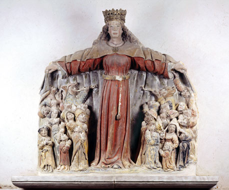 Dès le XVe siècle, l’image de la Vierge au manteau connaît un immense succès, la Mater omnium, « Mère de tout et de tous », abritant la foule des chrétiens à l’ombre de son manteau, appelée encore Vierge de miséricorde. Des artistes de renom y déploient leurs talents : Francesco Lippi, Ghirlandaio, Holbein le Jeune... Jean-Paul II nous explique ce qu’est ce manteau : « Pour nous qui vivons sur cette terre, pour nous, pauvres fils d’Ève en exil, vous avez pour manteau le soleil du Christ depuis Bethléem jusqu’à Nazareth, depuis Jérusalem et le Calvaire. Vous êtes revêtue du soleil de la Rédemption de l’homme et du monde par la croix et la Résurrection de votre Fils. [2] » C’est la Vierge-du-Bon-Secours, la Mère-de-Toutes-Grâces et de Toutes-Joies...